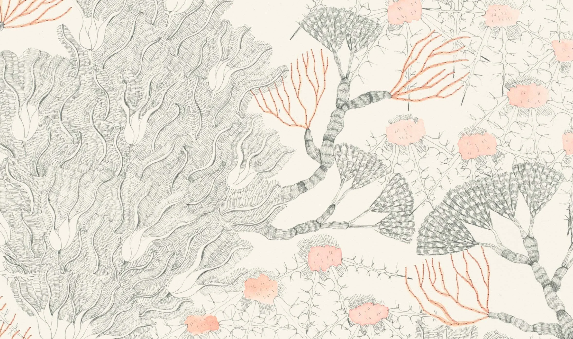 Works on paper are made using ink, watercolour and sometimes embroidery on watercolour paper. The work explores liminal spaces between art and craft and between art and science; looking to these influences to explore tactility and materiality.